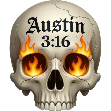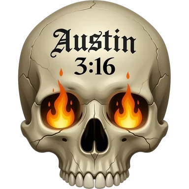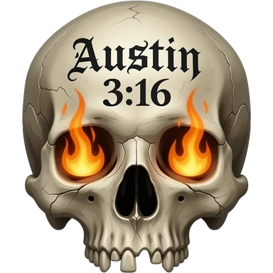 A human skull that has aged with the words Austin 3:16 in black ink, eye socket, and nose cavity need flames, words need to be carved in to its forehead in a Gothic font, show cracks, weathering, pieces missing emoji