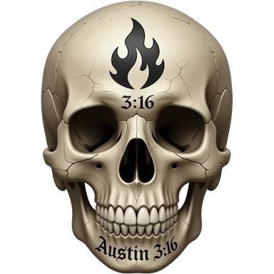 A human skull that has aged with the words Austin 3:16 in black ink, eye holes need fire carved in to its forehead in a Gothic font, show cracks, weathering, pieces missing emoji