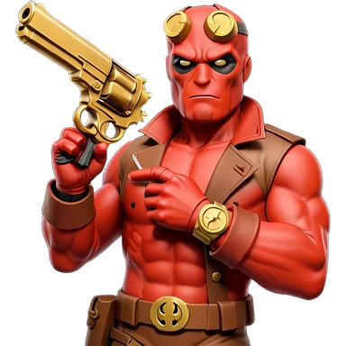 cinematic realistic superhero Hellboy by Mike Mignola jumps with a bronze pistol emoji
