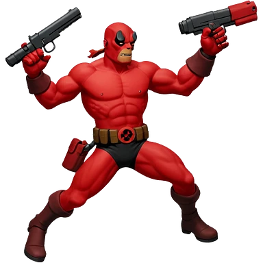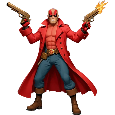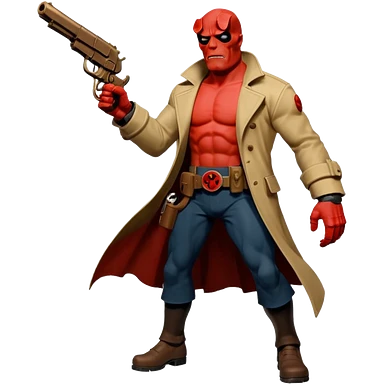 cinematic realistic superhero Hellboy by Mike Mignola jumps and shoots with a bronze pistol emoji