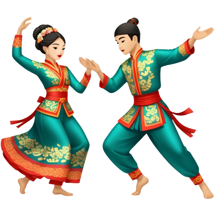 Cinematic Realistic scene of two performers executing a traditional Vietnamese folk dance, adorned in intricately patterned traditional costumes, captured in fluid motion with soft, culturally rich lighting emoji | AI Emoji Generator