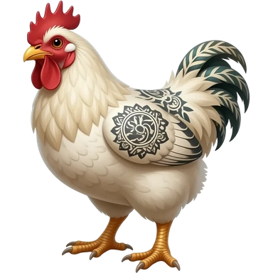 surrealistic - a huge ivory, plucked bald, tattooed chicken , shown at a 45 degree angle emoji