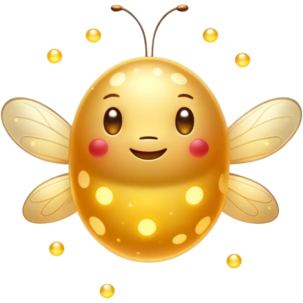 Cinematic tiny glowing firefly, round and chubby, soft golden light, tiny happy face, gentle floating motion, surrounded by dreamy sparkling dots. emoji | AI Emoji Generator
