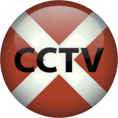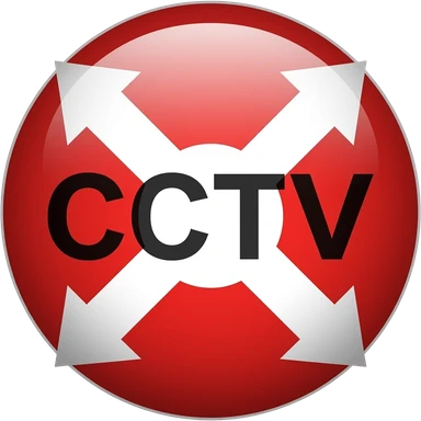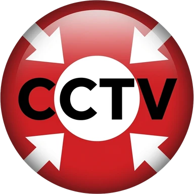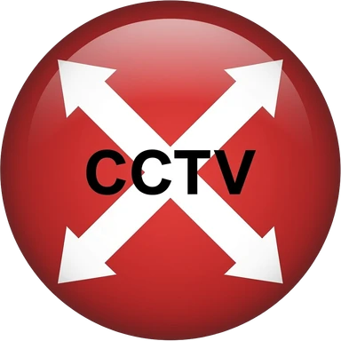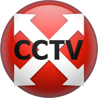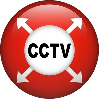 Red filled circle with white X and arrow on all end points on the X white circle in the middle. Biggest CCTV word in the centre in black emoji