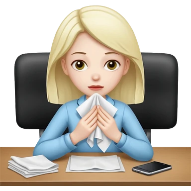 хвора дівчина сидить в офісі за столом, у неї в руках хустинка emoji
