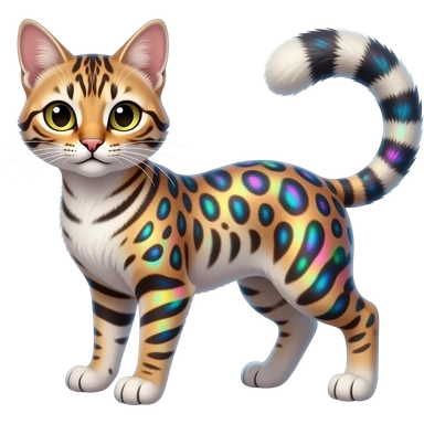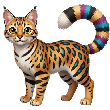 Iridescent Tribal-Patterned vernid-Civet-Genet-Bengal-Cat-Bobcat-Caracal-Serval-animal-hybrid-mix fantasy creature LiLaiRa Kamirah Falvie whiskers paws full body gradient stripes tufted tail feline emoji