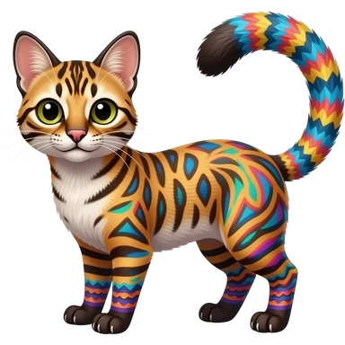 Colorful Tribal-Patterned vernid-Civet-Genet-Bengal-Cat-Bobcat-Caracal-Serval-animal-hybrid-mix fantasy creature LiLaiRa Kamirah Falvie whiskers paws full body gradient stripes tufted tail feline emoji