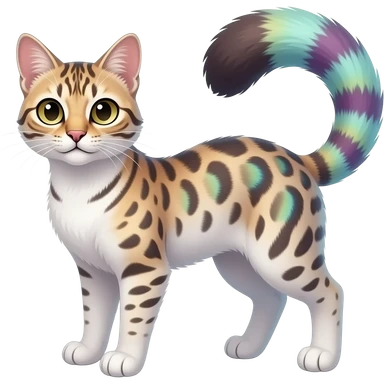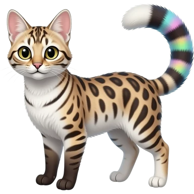 White soft silky smooth vernid-Civet-Genet-Bengal-Cat-Bobcat-Caracal-Serval-animal-hybrid-mix fantasy creature LiLaiRa Kamirah Falvie whiskers paws full body with colorful gradient iridescent patterns fur markings and with a long thin tufted tail feline emoji