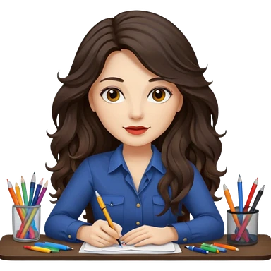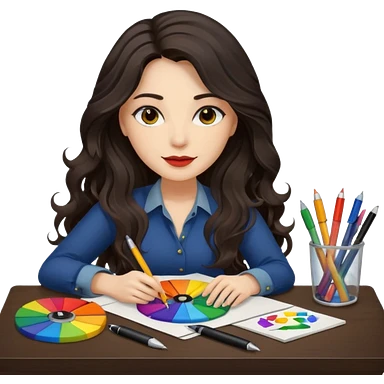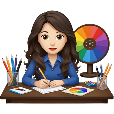 female dark wavy long hair graphic designer , color wheel, pens, papers , desktop emoji