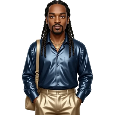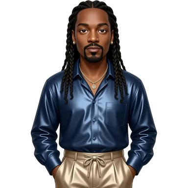 Snoop Dogg with dark brown eyes, long black dreads, dark blue metallic blouse, beige metallic baggy pants, necklace and earrings emoji