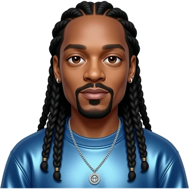 Snoop Dogg with dark brown eyes, long black dreads, steel blue metallic sweatshirt, necklace and earrings emoji