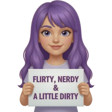 girl with long purple hair holding a FLIRTY, NERDY & A LITTLE DIRTY sign emoji