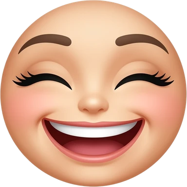 classic yellow emoji face with eyes closed, eyebrows pointing upwards, upper teeth showing in a wide smile emoji