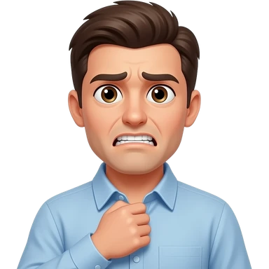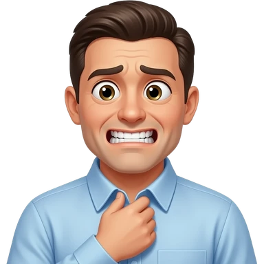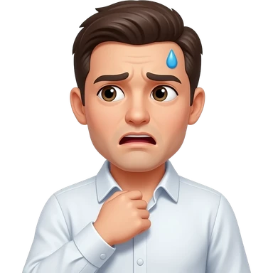 classic yellow face. The emoji has an awkward, nervous expression with eyes looking away to the side, avoiding eye contact. One hand is reaching up to pull and tug at the collar of a white dress shirt, creating a gap as if gasping for air. A single drop of blue sweat drips from the forehead. emoji | AI Emoji Generator
