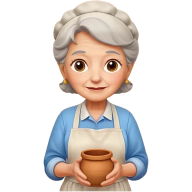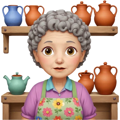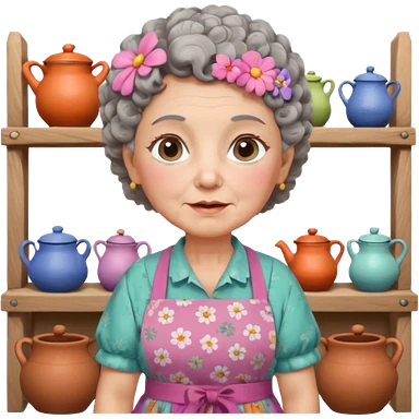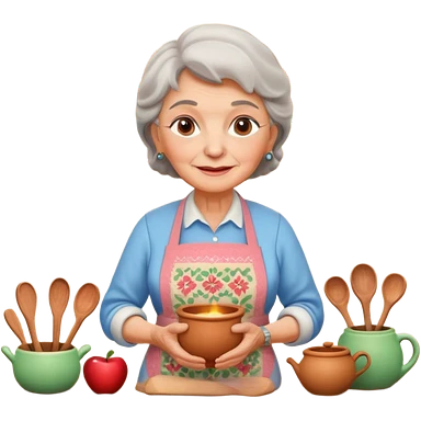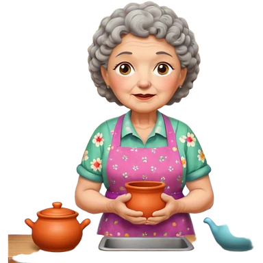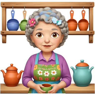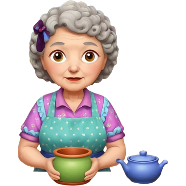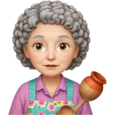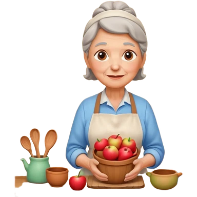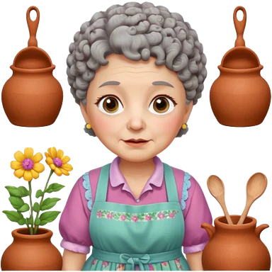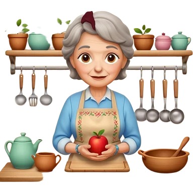 cartoon Apple iOS emoji style rural elderly woman, chubby face, short gray curly hair, flowery blouse, colorful apron, big expressive eyes, pastel colors, Chilean wooden kitchen background, clay pots, warm light, detailed and clean vector art emoji