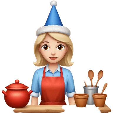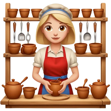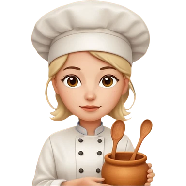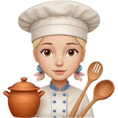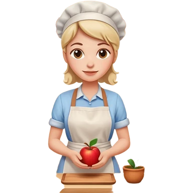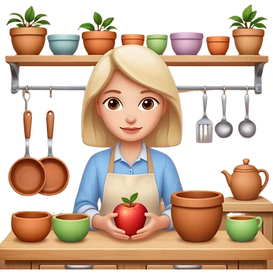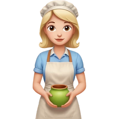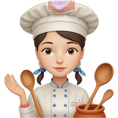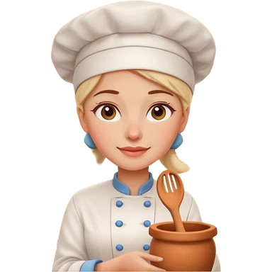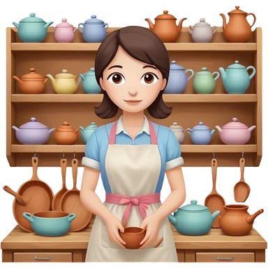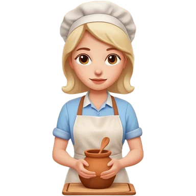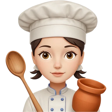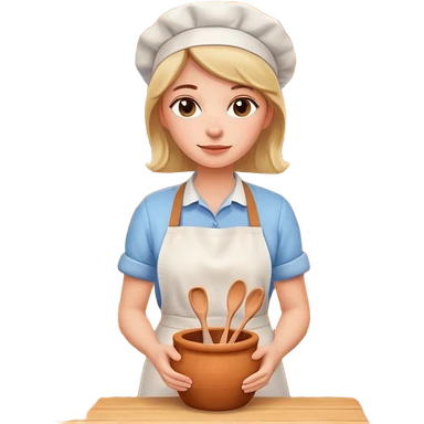 cartoon Apple iOS emoji style woman, pastel colors, Chilean wooden kitchen background, clay pots, warm light, detailed and clean vector art emoji