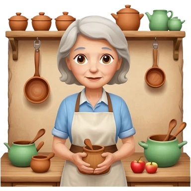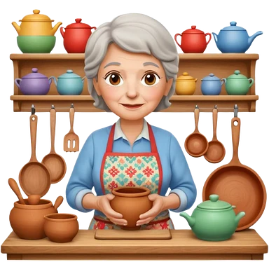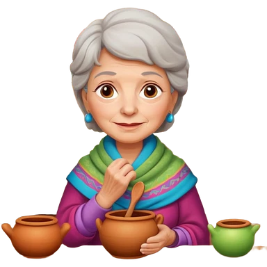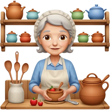 cartoon Apple iOS emoji style rural elderly woman, pastel colors, Chilean wooden kitchen background, clay pots, warm light, detailed and clean vector art emoji
