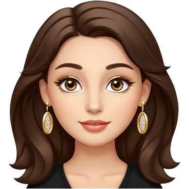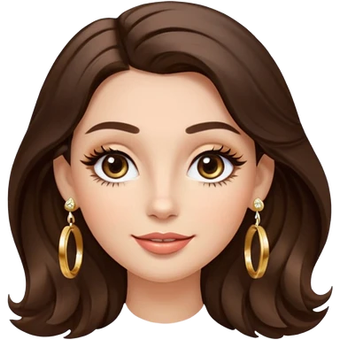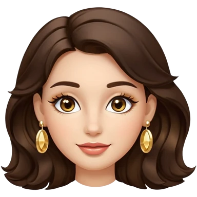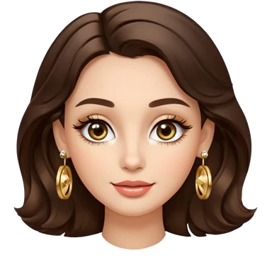 Luxury Milan girl Greta emoji: oval face, flawless skin, big light almond eyes with lashes/eyeliner, arched brows, flirty half-smile glossy lips, beauty mark, wavy warm brunette hair, gold hoop earrings, soft glow, champagne bg with sparkles, 3D sticker style, centered. emoji