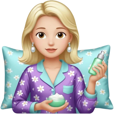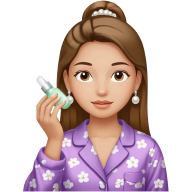 Clean girl aesthetic emoticons, apply skincare products, pearl earrings, glowing skin, pajamas, soft lighting emoji