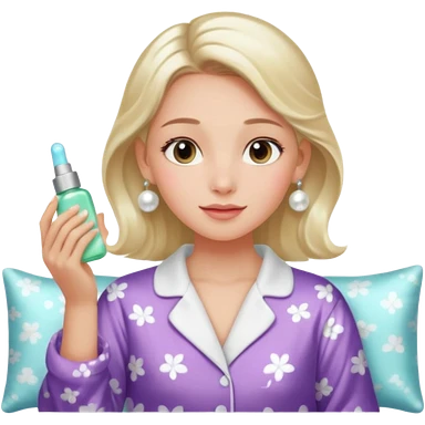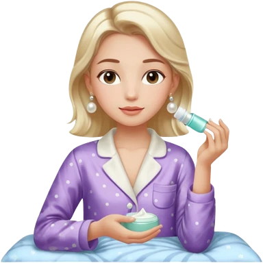 Clean girl aesthetic emoticons, apply skincare products, pearl earrings, glowing skin, pajamas, soft lighting emoji