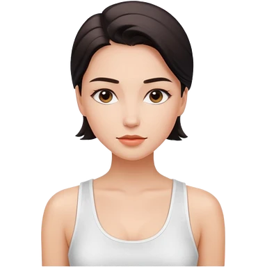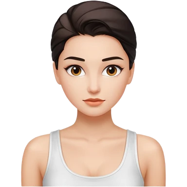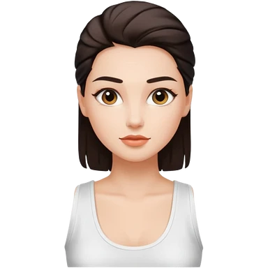 Clean girl influencer character, chest-up portrait.Sleek tight bun hair color (auburn .Natural glossy makeup, soft blush, shiny lips.Minimal white tank top, small gold hoop earrings, delicate gold necklace.Black sunglasses on head.Rolled yoga mat hanging over her shoulder. emoji