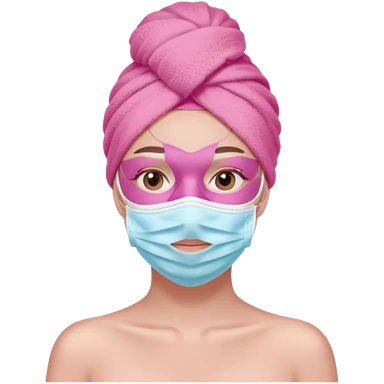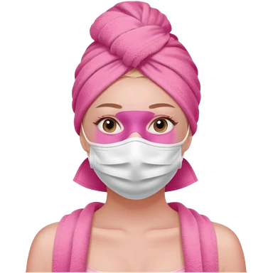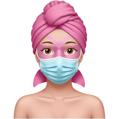 Clean girl influencer character, chest-up portrait, pink head towel, half-face facial mask, minimal self-care look, clean modern illustration emoji