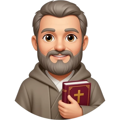 wise old man with grey brown hair robe slight smile brown eyes beard with burgundy book that has a cross on it no circle emoji