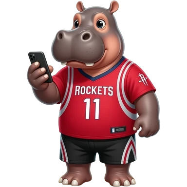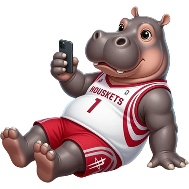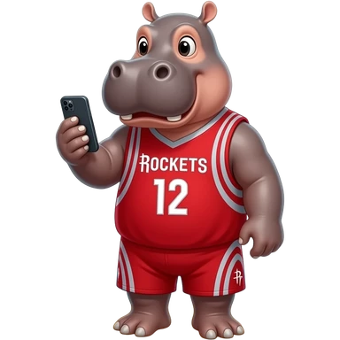 hippopotamus wearing basketball rockets jersey playing cellphone in beach emoji