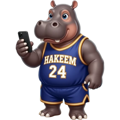 hippopotamus wearing hakeem jersey playing cellphone in beach emoji