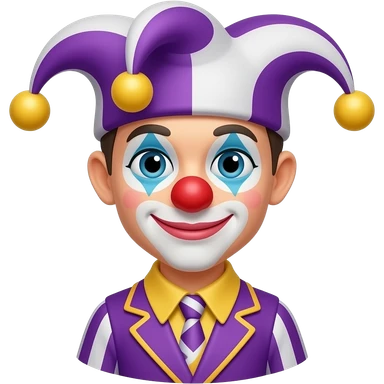 ID photo of a sad clown emoji, white face paint, red nose, classic makeup, multiple tears, short curly pastel purple hair, polka-dotted costume in soft tones, glossy highlights, centered, white background emoji