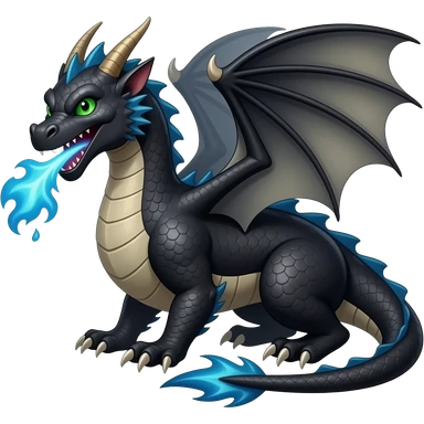 Dragón negro con ojos verdes y aliento de fuego azul emoji