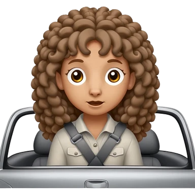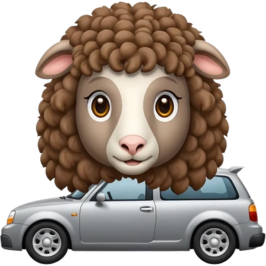 a sheep with long brown curly hair and brown eyes on a grey car emoji