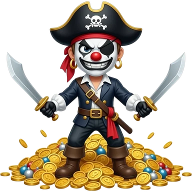 Angry Clown Pirate with Black and White Face paint with Dual swords standing on treasure pile emoji