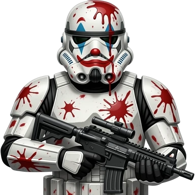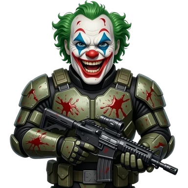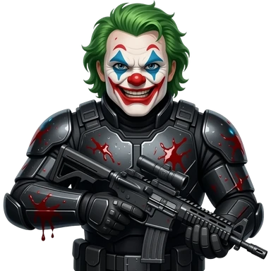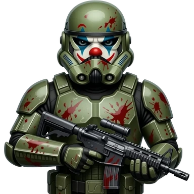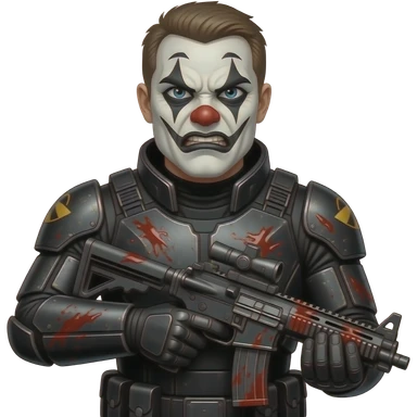Angry Clown Space Soldier with Black and White Face paint in Black Space Armor with Laser Rifle covered in Alien blood emoji