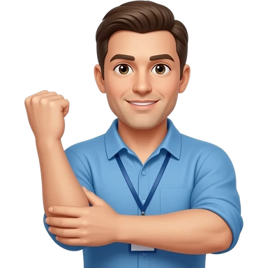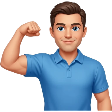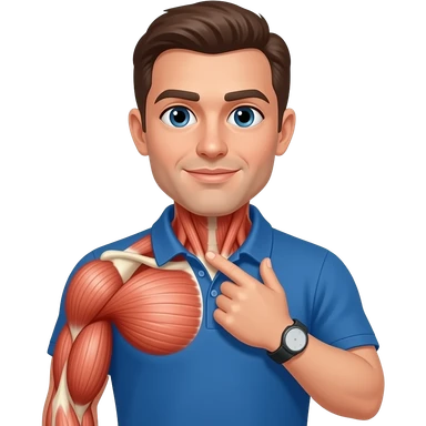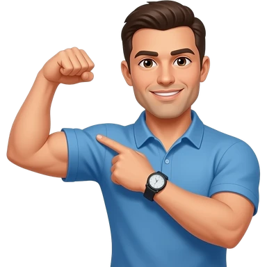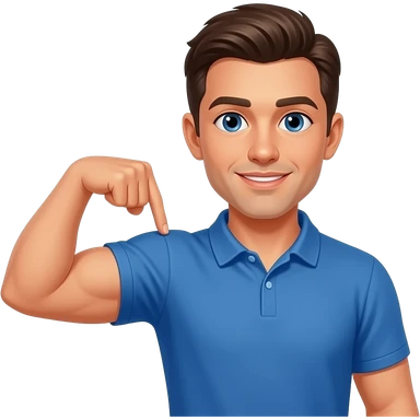 coach in a blue shirt touching his deltoid muscle with finger tips emoji
