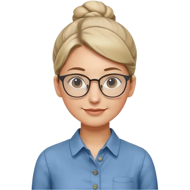 Librarian Style – neat bun, thin metal glasses, calm gentle smile. emoji