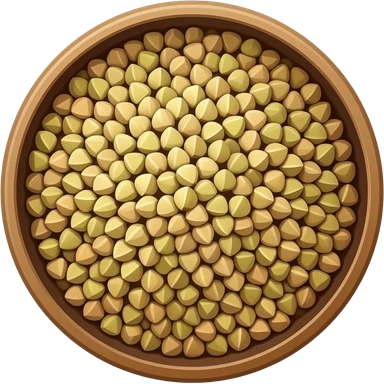 buckwheat groats pile, realistic triangular seeds, mix of green, beige, tan and brown tones, detailed texture with shadows and highlights, top view, wooden bowl emoji