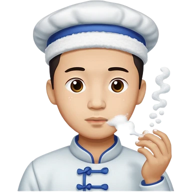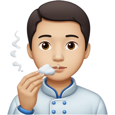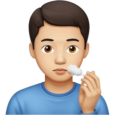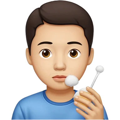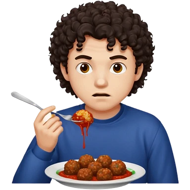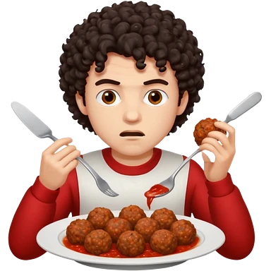 Ragazzo di 20 anni con capelli ricci scuri, leggermente arrabbiato che mangia 2 polpette emoji