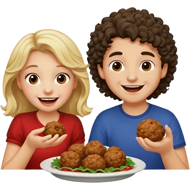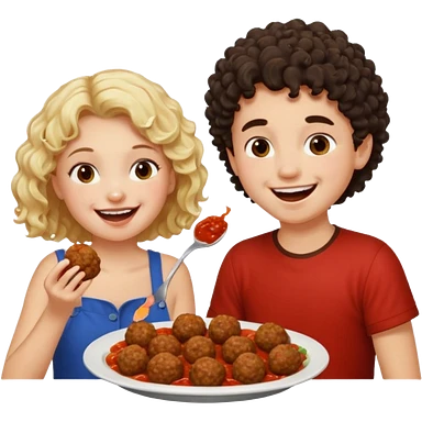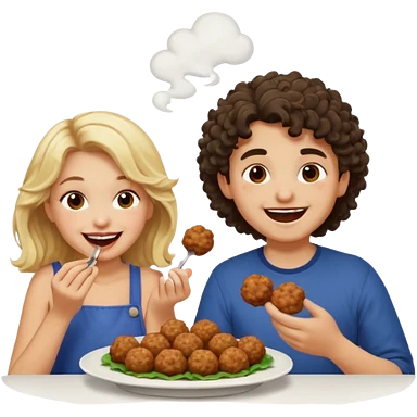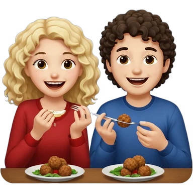 Ragazza bionda leggermente riccia che ride ad un ragazzo con i capelli ricci scuri mentre mangia polpette emoji