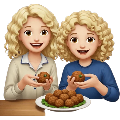 Ragazza bionda leggermente riccia e lunghi che ride ad un ragazzo con i capelli ricci scuri mentre mangia polpette emoji
