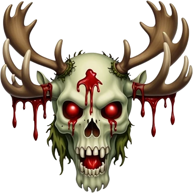 A giant looming Alaskan zombie Titan with blood dripping moose antlers and covered in moss and blood. In the style of your bleeding skull art emoji