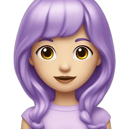 Jeune femme avec de longs cheveux bruns attachés en une haute queue-de-cheval bouclée, portant une robe violette moulante avec des broches dorées sur les bretelles, regard en coin et sourire malicieux, style animation Disney emoji