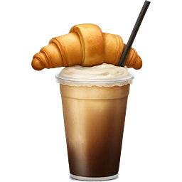 A croissant with a face with a mustache drinking a cup of coffee emoji