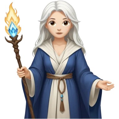 White Long Haired Women, Sorceress with staff — flowing white hair, calm face. emoji