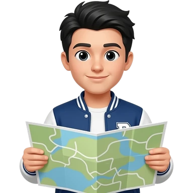 college student , black hair , with varsity jacket. hold a map emoji