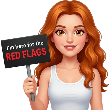 sexy girl with long wavy ginger hair and ginger eyes wearing a white tanktop is holding a black colored sign with NO RED FLAGS TO ME written on it emoji