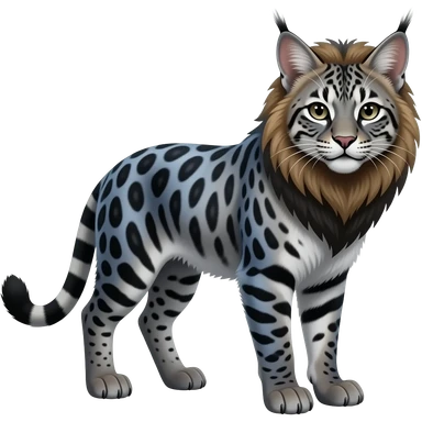 Realistic patterned marked edgy greyish blackish whitish silvery Shiny Colorful Glossy Genet-Caracal-Lion-Bobcat-fusion-animal-hybrid-creature, full body, tufted ears, long thin tufted tail emoji