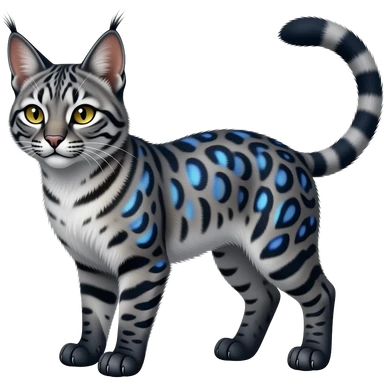 Realistic rosette-patterned marked edgy bluish Shiny Colorful Dusky Dark Glossy Genet-Caracal-Lion-Bobcat-fusion-animal-hybrid-creature, full body, tufted ears, long thin tufted tail emoji