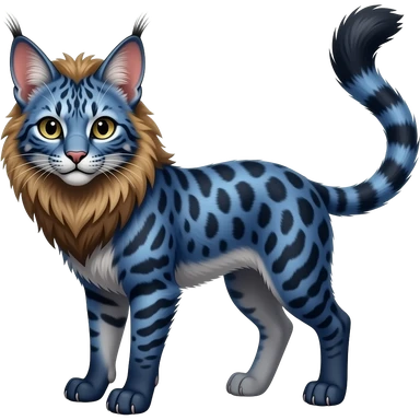 Realistic wild feral rosette-patterned marked edgy bluish Shiny Colorful Dusky Dark Glossy Genet-Caracal-Lion-Bobcat-fusion-animal-hybrid-creature, full body, tufted ears, long thin tufted tail emoji