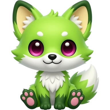Grassy grass-type-elemental big-eyed Cute chibi kawaii mossy forest Neon-light-lime-green furry fox with white belly and white muzzle, dark-green paws, dark green ears, and magenta eyes, pastel-yellow-beige inside ears-pinna/ear flap, pink paw pads emoji